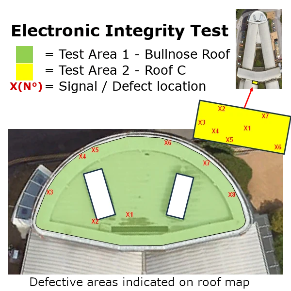 Each defect is physically marked on the deck, numbered, photographed and mapped in a comprehensive report, including fault descriptions, annotated layout drawings, and colour photographs. This enables Roof Technology to create a tailored repair specification using either single–ply or cold–applied liquid membranes (our approved systems), ensuring integrity in both installation and waterproof performance.